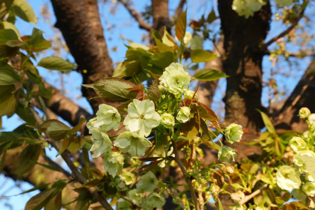 咲き始めの花びらの色は、なんと薄い緑色です。実際には開花時から花の中心部にも赤はあるそうなのですが、開花時には目立ちません。日数とともに徐々に中心部から赤みが増して、白も入ってきて一般的な桜のような感じになり、散る頃にはかなり赤くなるという変化をします。ある意味、一本で五色桜状態です。