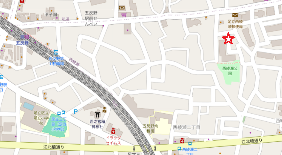 そんな御衣黄はこちら(赤い星のところ)にいます。ソメイヨシノよりも少し花の時期は遅いです。