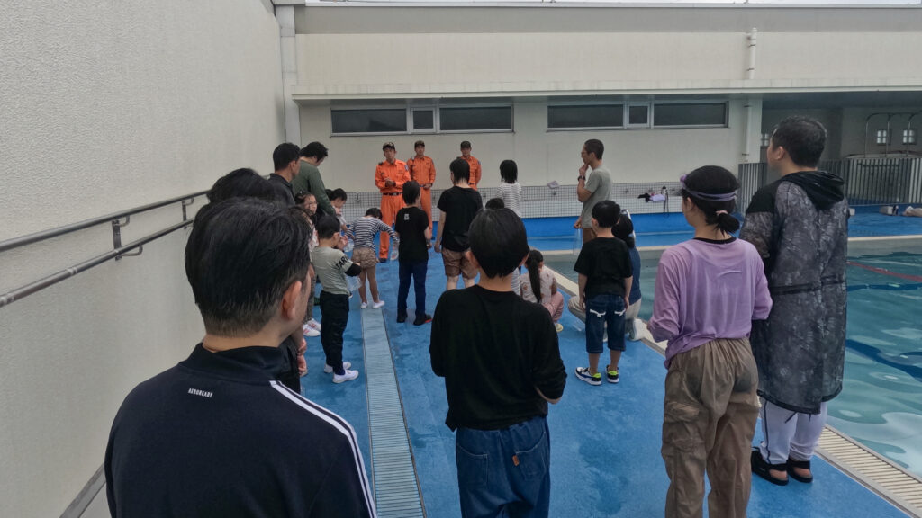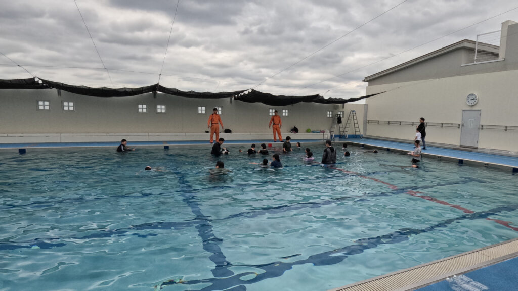 今回の講座では服を着たまま水に落ちた際に、落ち着いて体力を温存すること、浮いて助けを待つ「ういてまて」の技術を習得する訓練を行いました。