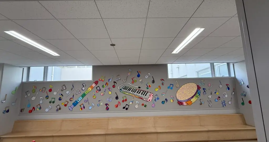 最後に、音楽会の会場や児童玄関から続く通路には、この日のために子ども達みんなで作った音符や楽器が装飾されていて、音楽会を盛り上げていました。色鮮やかで華やかな気分で音楽会を楽しむことができました。