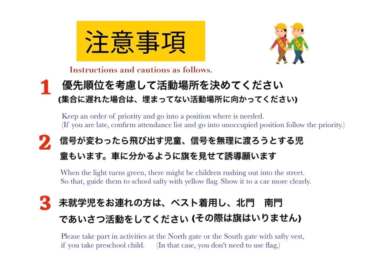 いよいよ、1学年の保護者が「あいさつ・見守りたい(隊)」の当番となります。そうした中、学校から案内は来ていたけれど、結局どこで何をするのだろう?そんな声が1学年保護者からありました。