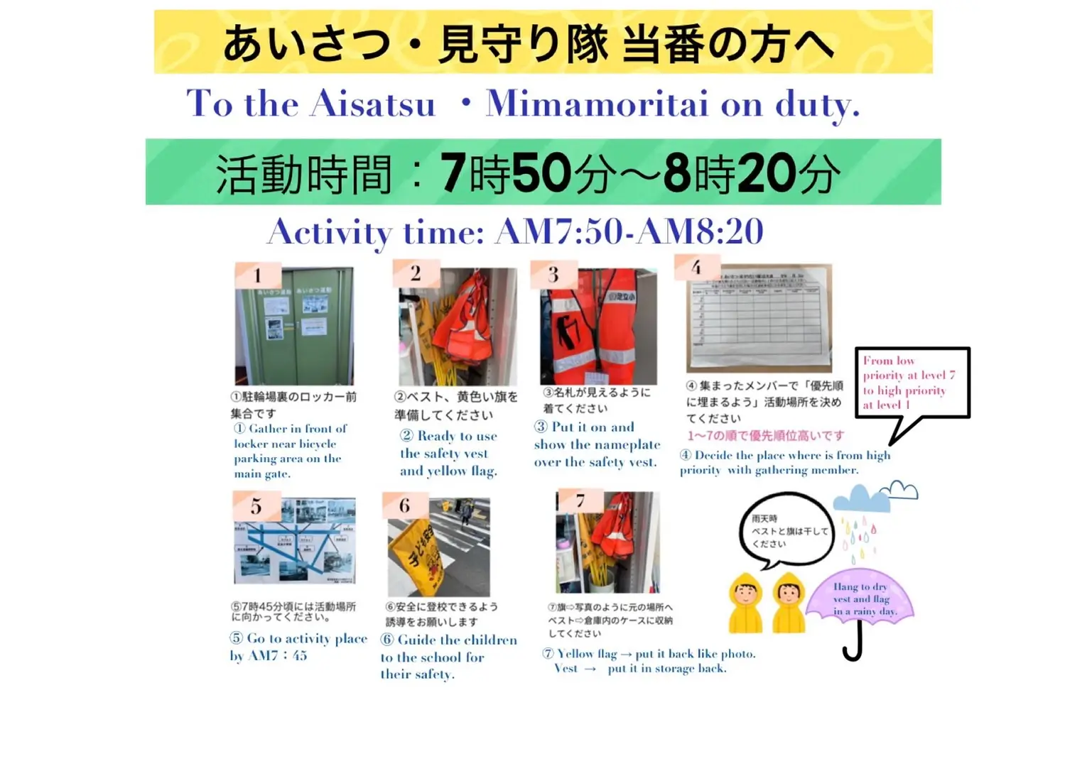 それでは、あいさつ・見守りたい(隊)にご協力いただける保護者の皆さま、安全には十分注意して頂き、活動をお願いします。