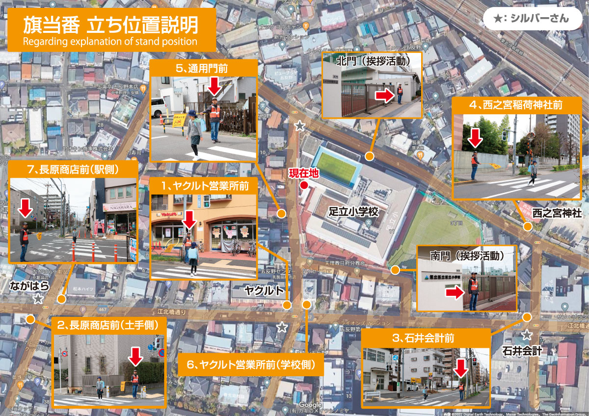 - どこに立つかに関しては、優先順位が決まっています。下記地図の1が優先度高、7が優先度低です。ご自身のお子さんが通るルートに立ちたいなどのご希望があるときは、参加者同士で決めてください。また、当番の方が遅れて来られる可能性があります。見守りポイントに重複して保護者が立つことがないよう、活動場所にお名前を記入してから向かってください。